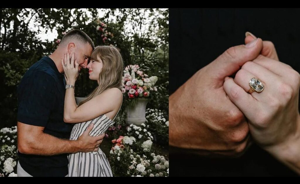 The proposal took place in a picturesque garden, under a floral trellis, as captured in a series of intimate photos—one of which showcases Swift’s breathtaking ring.
